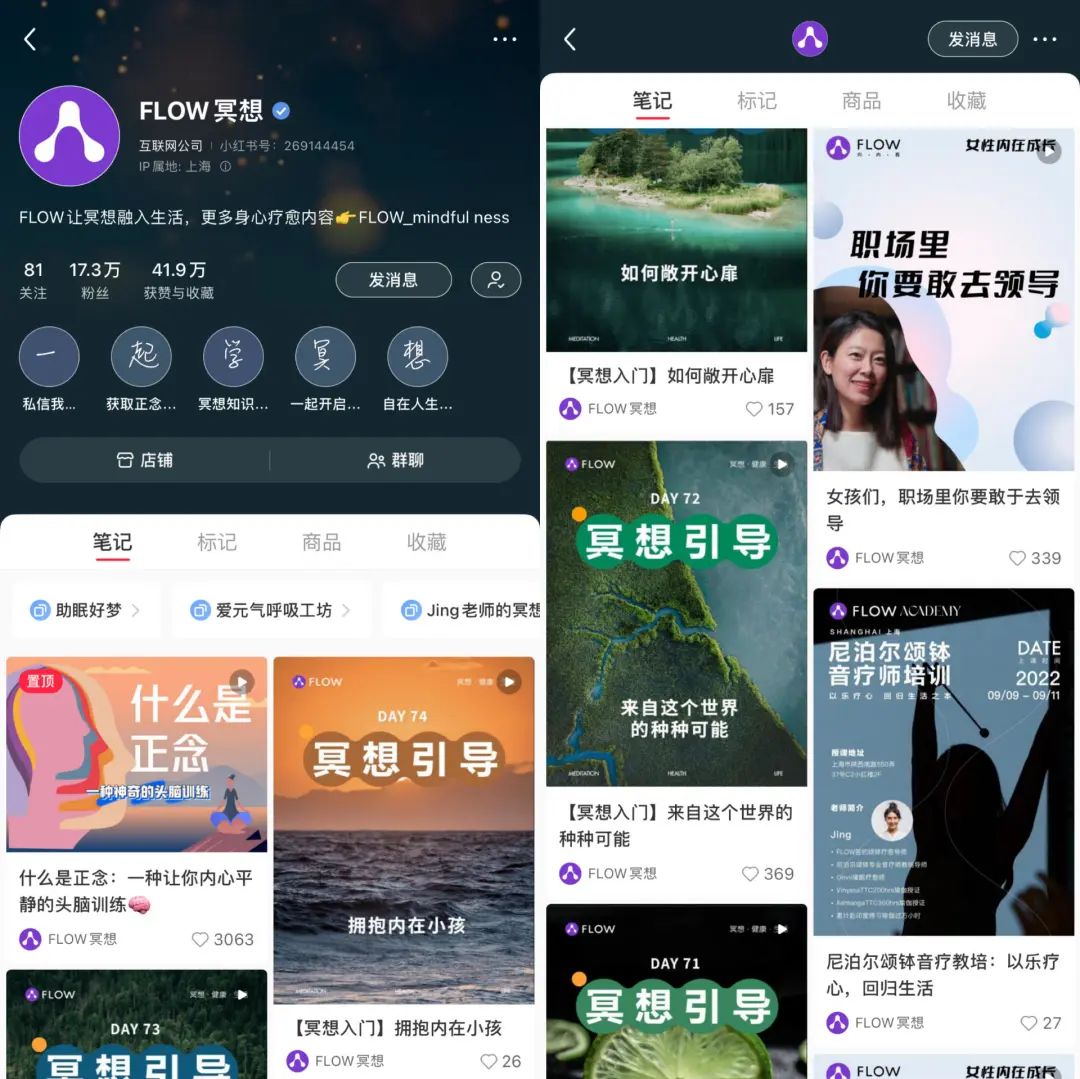 与此同时,FLOW冥想也在短视频平台建立了同名账号,其小红书账号粉丝量达17.3万,以分享冥想入门视频为主。此外,FLOW冥想也兼顾流量,用心理学知识分析社会普遍关注的话题,比如职场需要注意的细节,如何处理男女亲密关系等。