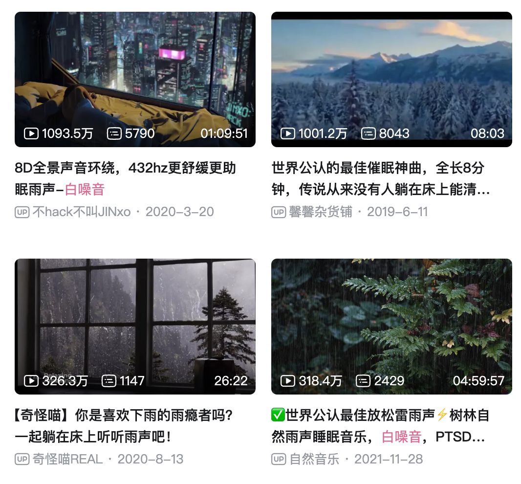 值得注意的是,引导声也是冥想视频区别于白噪音视频的特点之一。虽然两类视频同样主打助眠减压,但冥想更倾向于通过外界引导或自我提醒,带动其他感受。