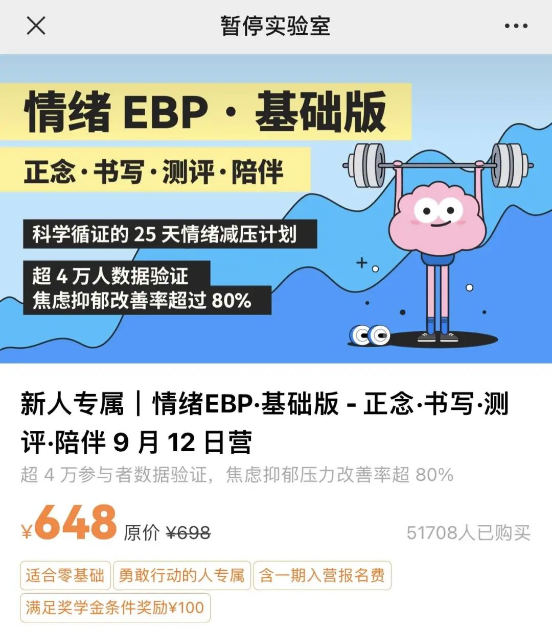 比如成立于2019年2月的“暂停实验室”,其创始人郭婷婷放弃了心理咨询的老路,推出以正念练习为主的“情绪减压计划”,训练周期为21天,费用为698元。截至目前,已超过5.1万人购买了该训练营课程,销售额达3609万元。据了解,用户通过奖学金返还的形式,实现无限次免费复训。
