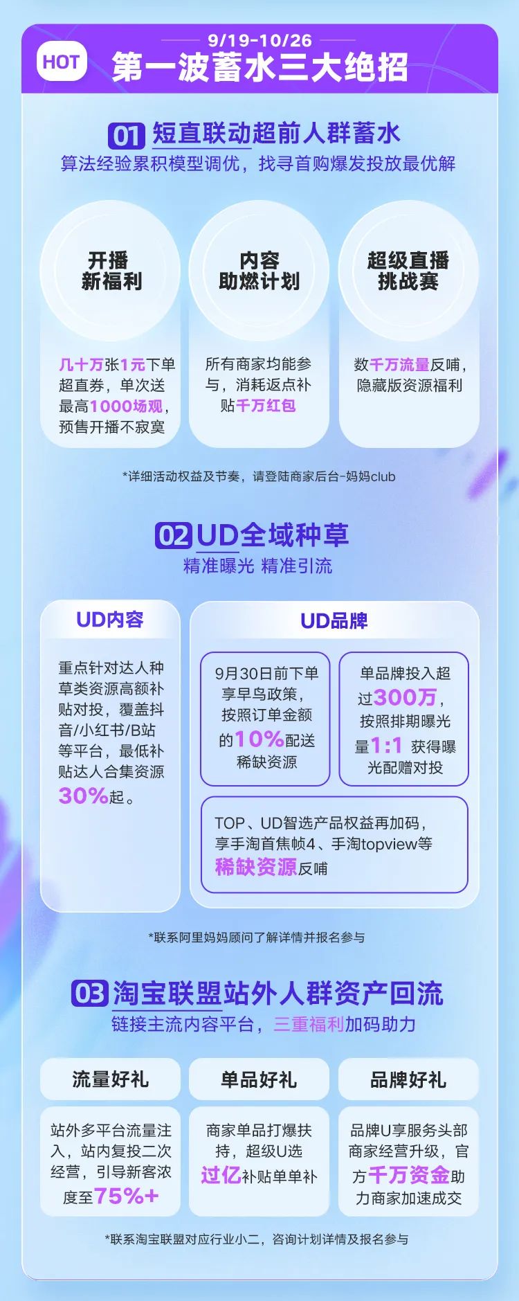 第一波9月19日-10月26日“前置蓄力人群资产+货品资产,实现预售首购爆发”。第一波的核心目标,是通过前置地进行人群和货品资产的蓄水,抓住长周期计划消费人群。在此期间,商家的主要目标为精准种草引流,扩展人群资产,以及新品与爆款运营,并通过全域拉新、老客激活等方式进行高频的目标人群渗透,实现人群的提前蓄水。