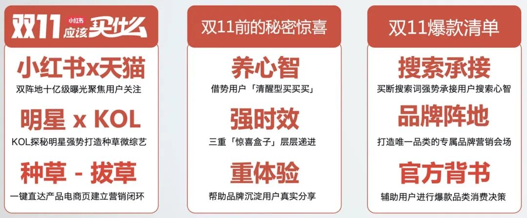 为了实现“以内容种草赋能品牌商家”的目的,小红书与天猫确定了“双11应该买什么”、“双11的秘密惊喜”、“双11爆款清单”三个大促IP。
