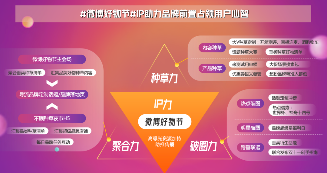 IP联动:以“微博好物节”为大促主会场,“不眠种草夜市”作为蓄力双11当晚的互动阵地,再通过不同垂类领域的IP进行联动,玩法全新升级的同时,共建大促内容氛围,最大化助推品效双收。