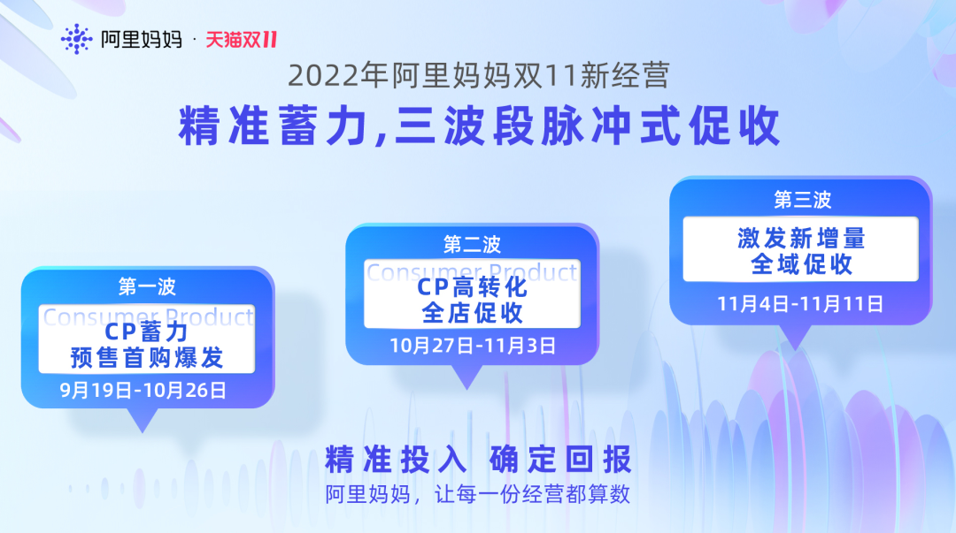 阿里妈妈创新性地提出双11新经营节奏:三波段脉冲式促收。第一波段要更注重拉新、老客激活以及爆品种草;第二波段注重人群深度转化,及时调整货品结构实现爆发;第三波段则注重跨品类人群增量和冲动型消费货品的爆发。