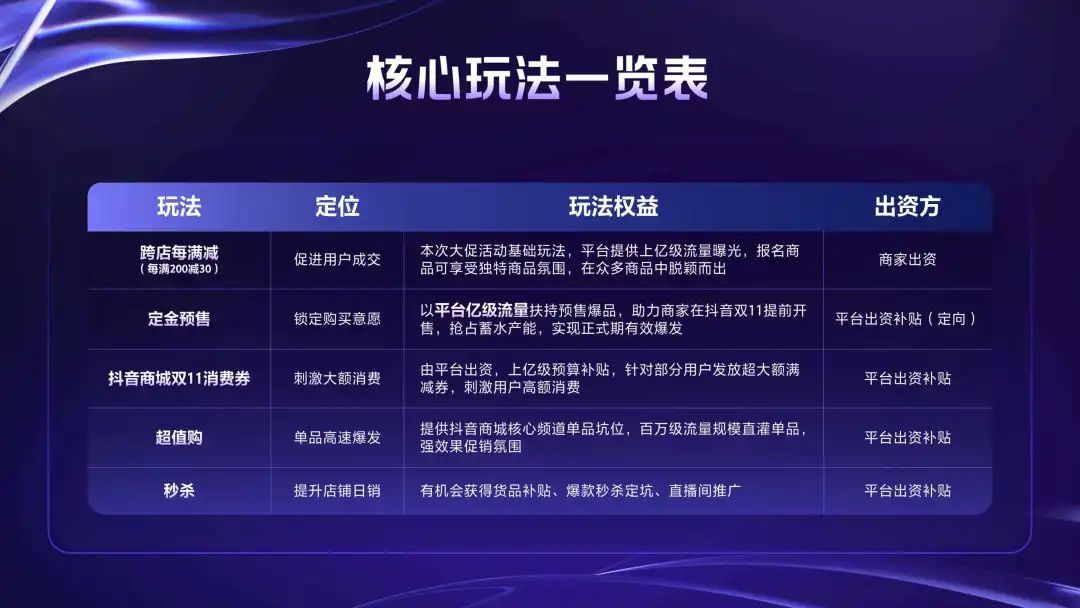 “跨店每满减”玩法是双11的核心玩法之一,为商家商品提供亿级流量曝光、获得抖音商城首页曝光机会,在众多商品中脱颖而出。