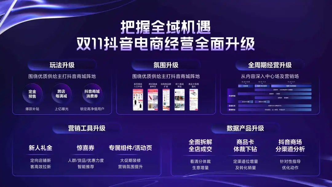 在抖音电商罗盘方面,升级了商品卡、抖音商城和直播大屏功能,帮助商家获取更多流量,实时监控直播间数据表现。