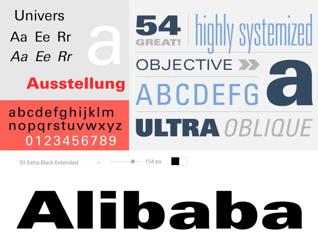 字体并非阿里独创,而是直接使用了广受设计师青睐多重样式字体 Univers 的特黑加长款(Extra Black Extended)。该字体由瑞士设计师 Adrian Frutiger 于1957年设计完成,它与 Helvetica 一起被称为「瑞士风格」字体,被广泛应用于包装、印刷品和品牌形象标志中。