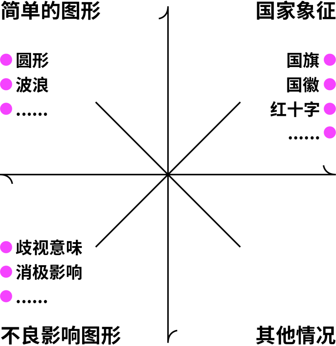当然还有最重要的一点,在设计之初就要注意避免使用一些比较简单的图形组合以及元素,如圆圈、波浪线等等越简单的图形越容易驳回,不得和各国家国旗、国徽、军旗、军徽、红十字、红新月等标志相同或者近似,另外一些带有民族歧视、有消极影响的也不要使用,这个范围没有非常的清晰,所以比较考验设计师和商标注册人员的经验。