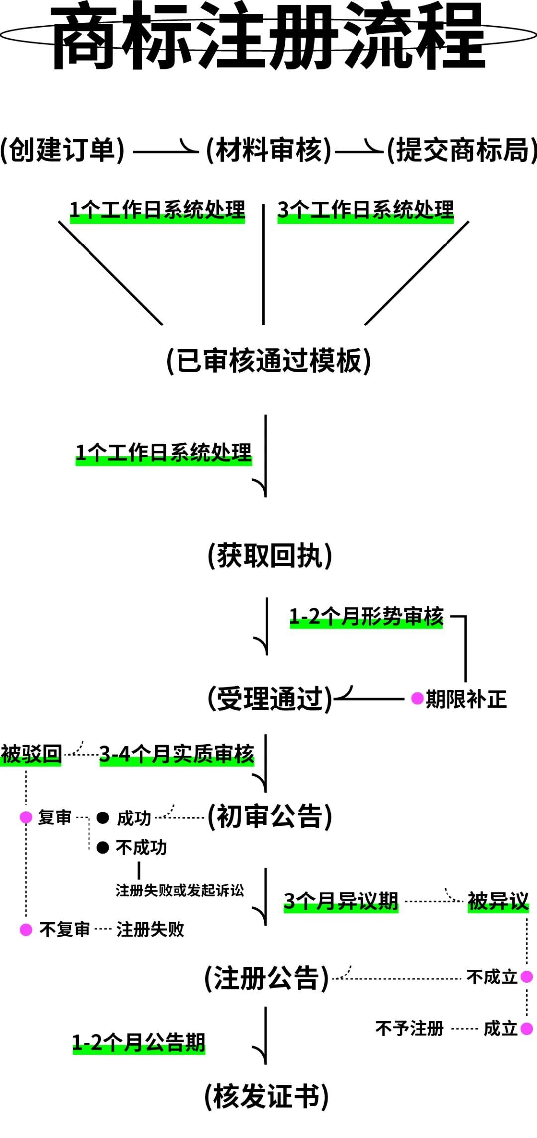 前期检索工作完成后,如果注册成功率较高则推荐尝试注册,其流程从创建订单开始,然后是材料审核之后提交给商标局,随后1个工作日内获取回执,这是证明你提交的重要回执,一定要拿到或者看到才行。