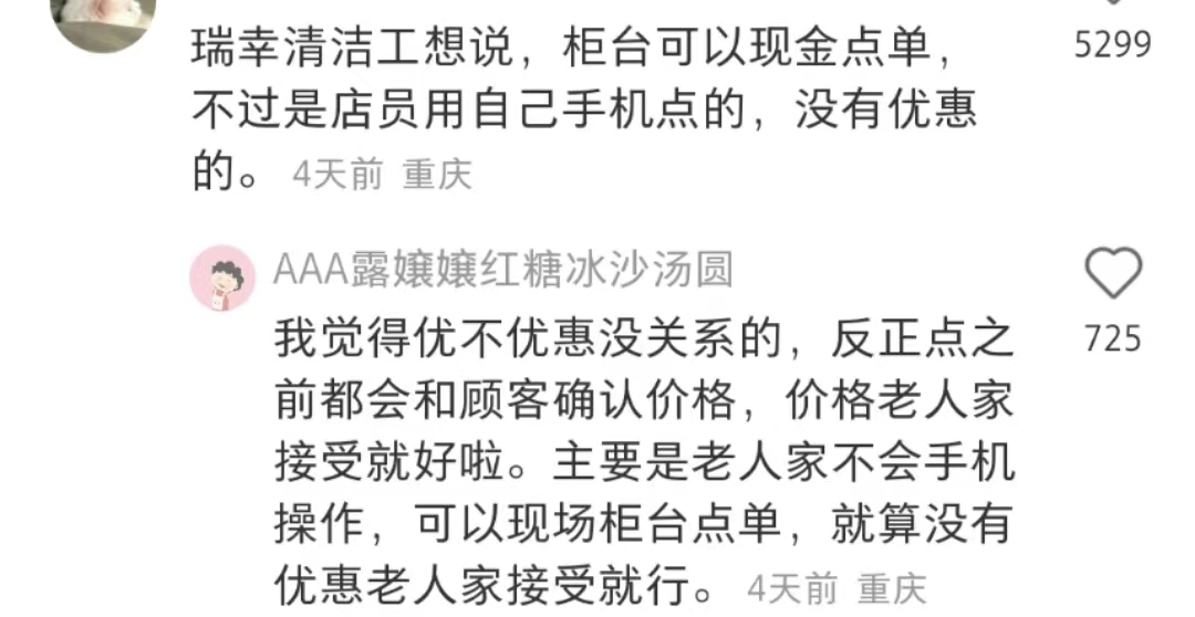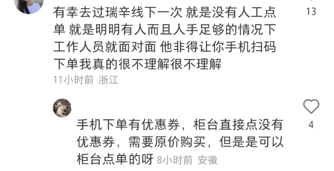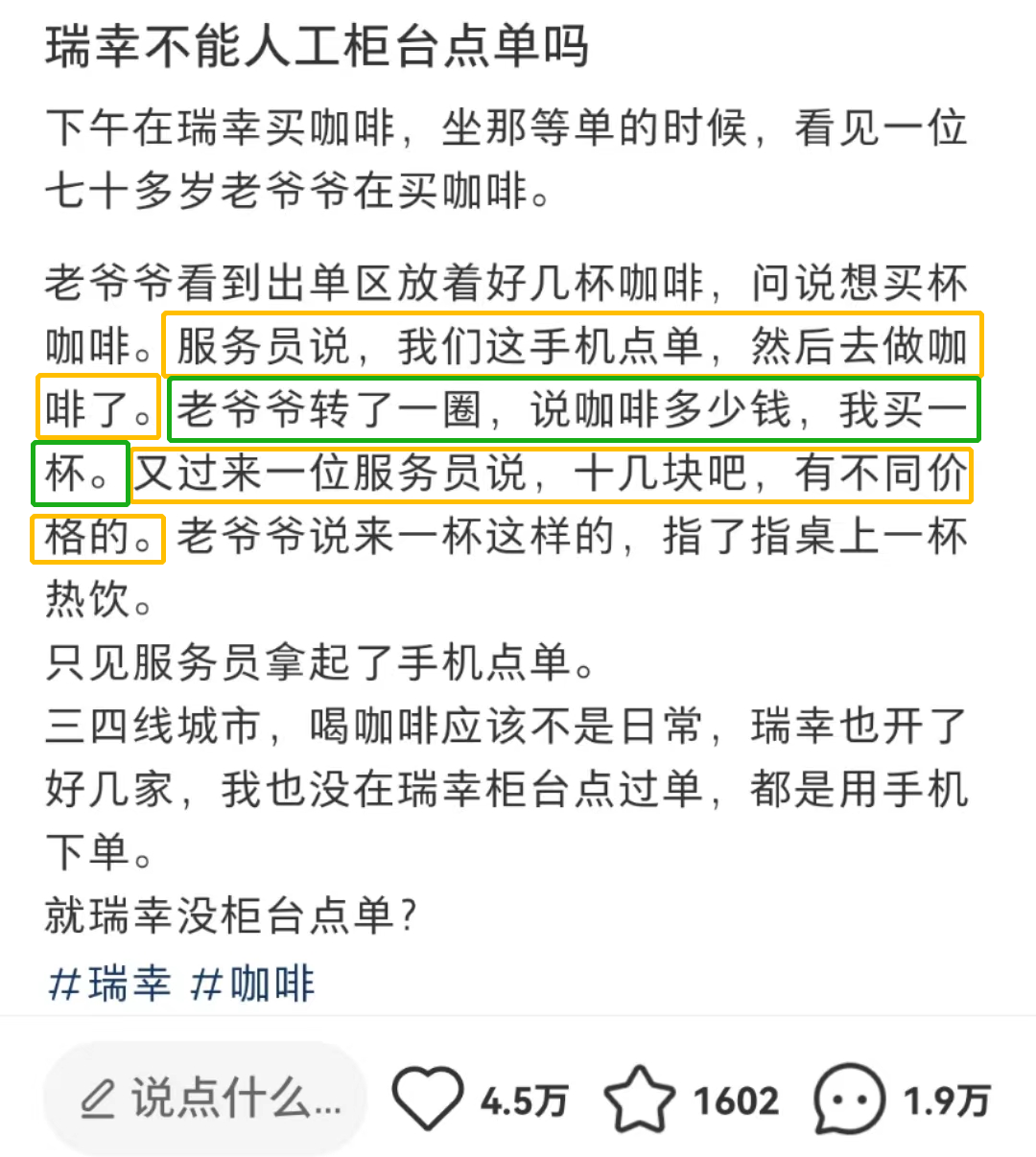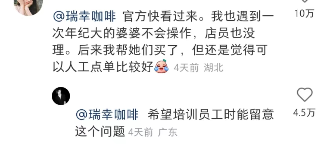 尽管没有人工点单,是瑞幸出于效率最大化的考量,但在做相关员工培训时,没有做到遇到老年人等特殊群体的相关培训,却是瑞幸在利益最大化上的缺失。