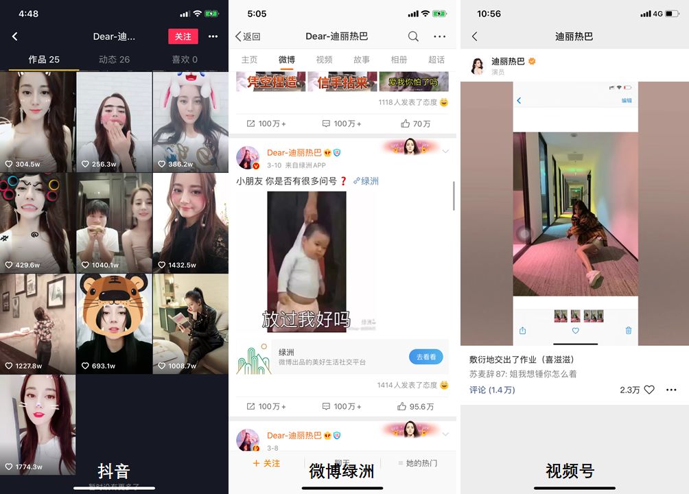 单从现存数据来看,打开视频号,你会发现除了明星、大V、还有官方号的视频阅读量较好外,其他视频的阅读效果并不理想。而且即使是明星、大V的视频号,其流量和微博、抖音平台相比还是有一定差距。我们找了迪丽热巴的数据做了个对比: