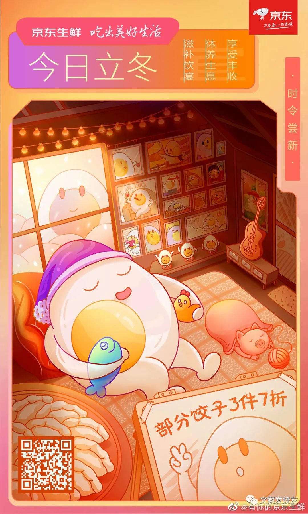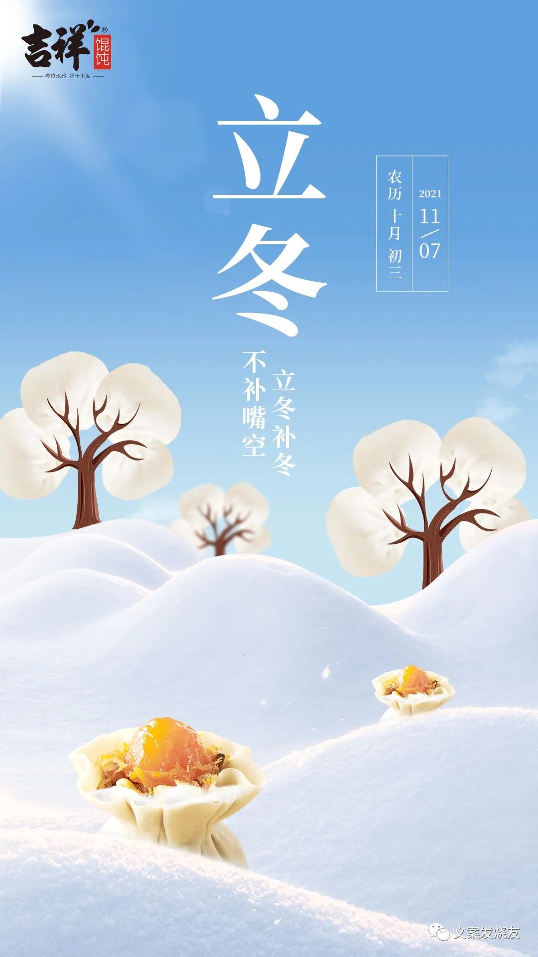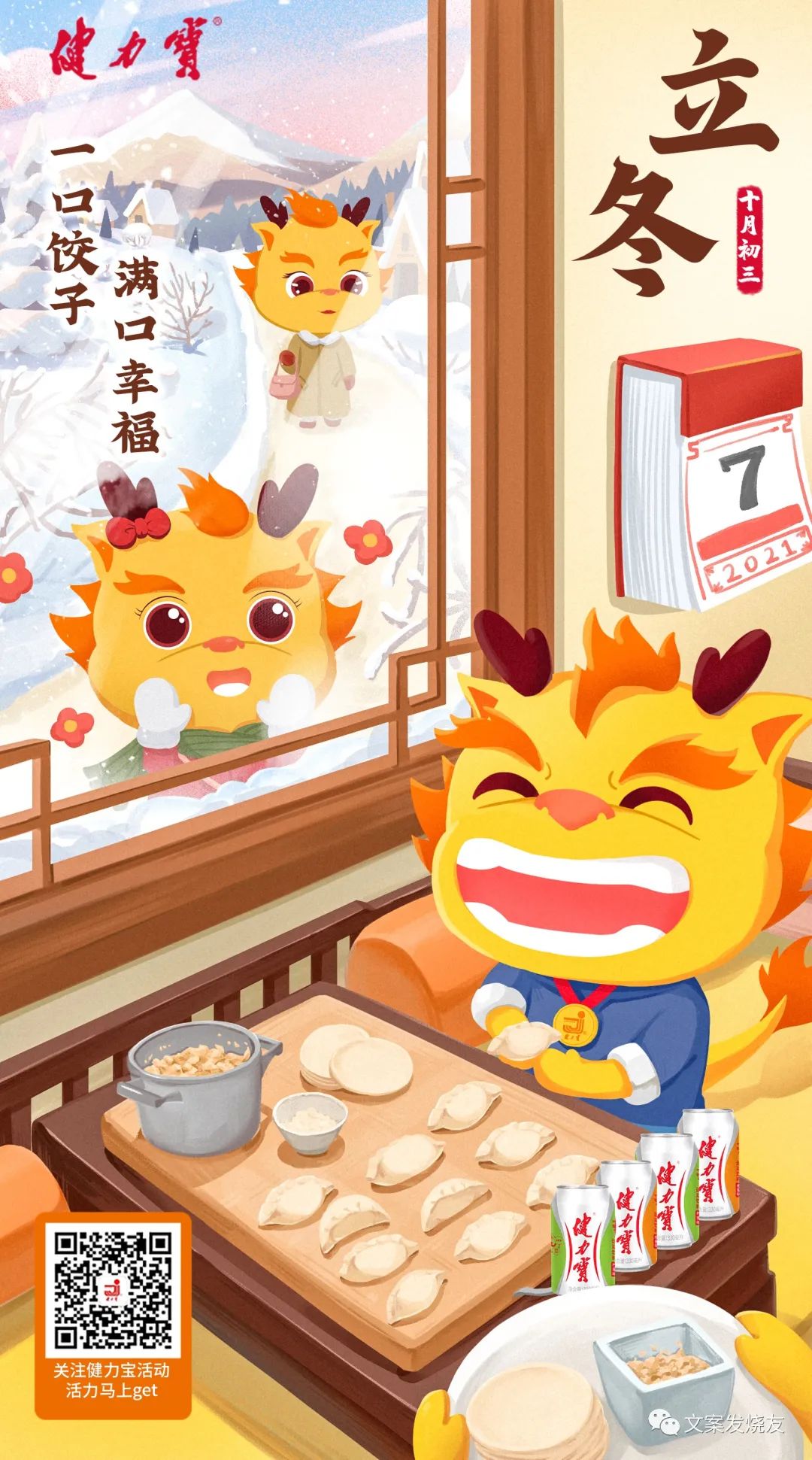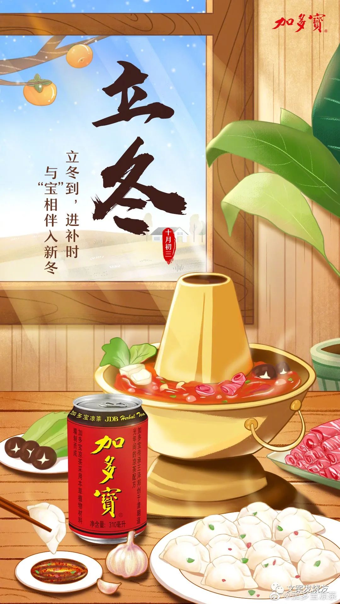 作为冬季开始的标志,提醒着我们是时候享受丰收,享受美食啦~一碗热气腾腾的饺子正适合搭配一罐王老吉,希望大家都能感受到入冬的快乐。
