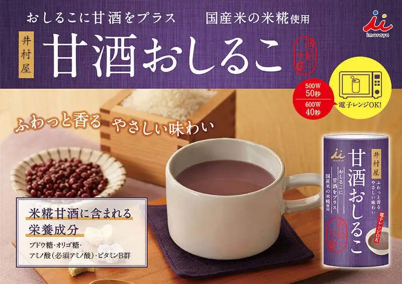 除了姜以外,酒也是典型的自带热属性的食物。在众多酒类食物中,甘酒因其健康益处而备受关注。其中,由米曲制成的曲甘酒营养丰富,甚至因为含有大量的维生素、氨基酸和矿物质等多种营养素,且易被人体吸收,还被亲切地称为“可饮用的点滴”。去年八月,井村屋株式会社便将曲甘酒与旗下红豆产品创新性融合,开发出新品红豆甘酒(甘酒おしるこ),产品在取下盖子后直接在微波炉中加热。