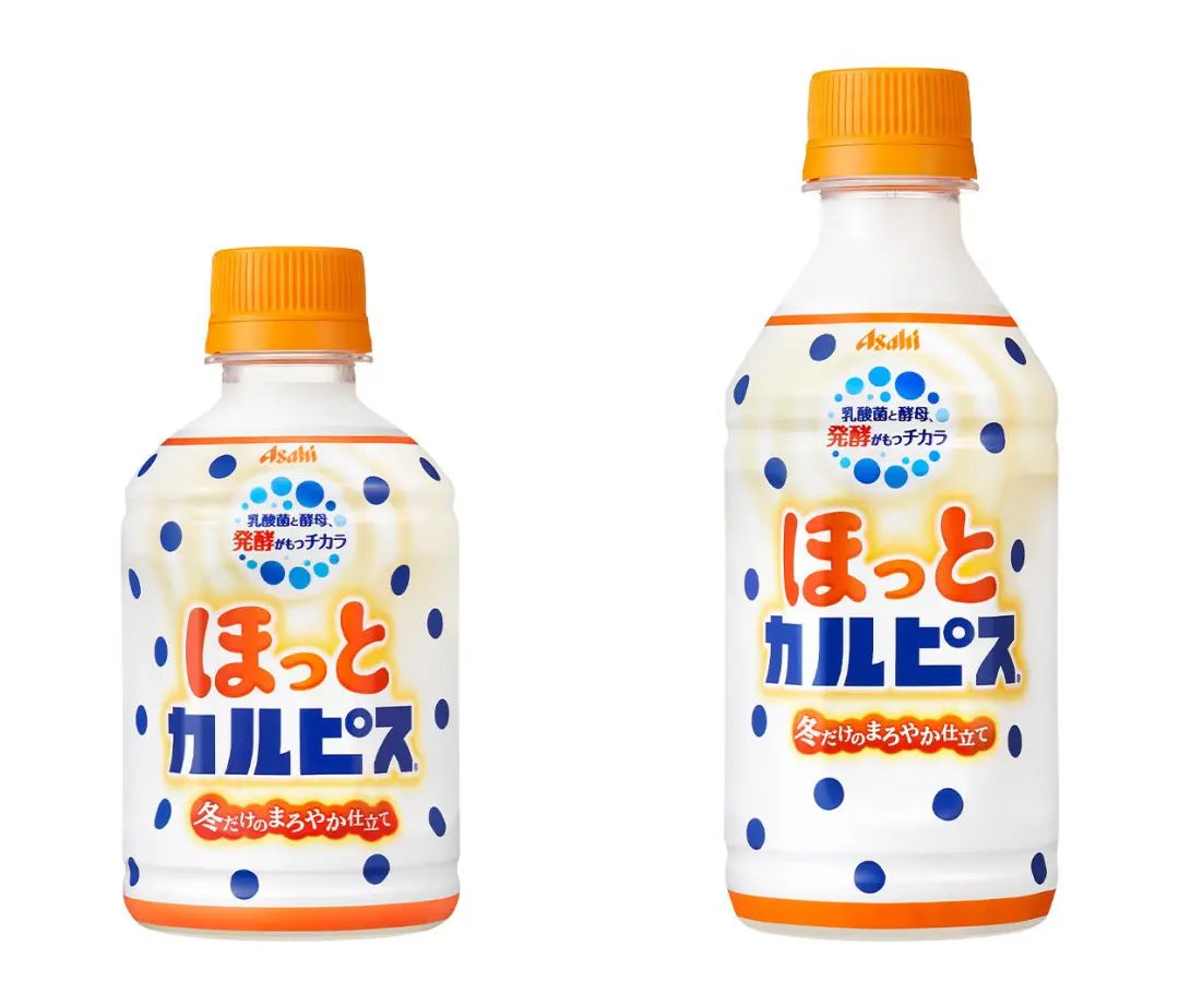 去年9月,朝日公司在日本发售了一款名为“热可尔必思”(“Hot Calpis”)的新乳酸菌饮料。该款新品采用独特的技术手段将酸味抑制,以便加热后口感更美味更醇厚;在包装采用了可尔必思的标志性波点纹,并用暖橙色来表达最适合寒冷冬天的温暖。