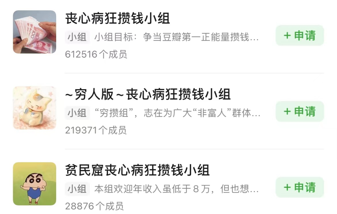豆瓣上“丧心病狂攒钱小组”“不买了!拔草互劝协会”“消费主义逆行者”等个专注省钱的群组,已经有了上百万的组员。网友们聚在一起,尝试对购物这一行为进行反思与审视,共同研究“科学抠门”的方法。组员们还会时常互相提醒不要被消费主义所裹挟,希望大家都能做金钱的主人。