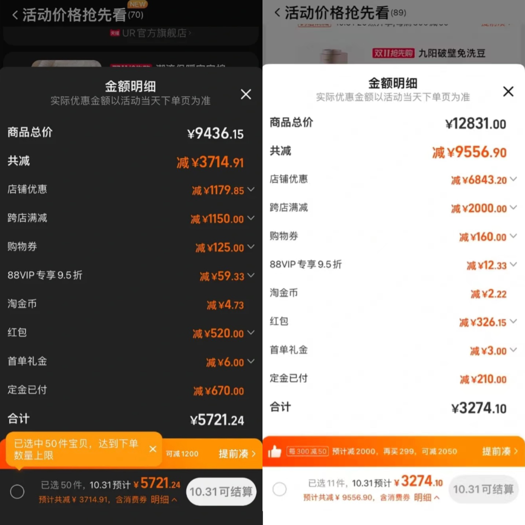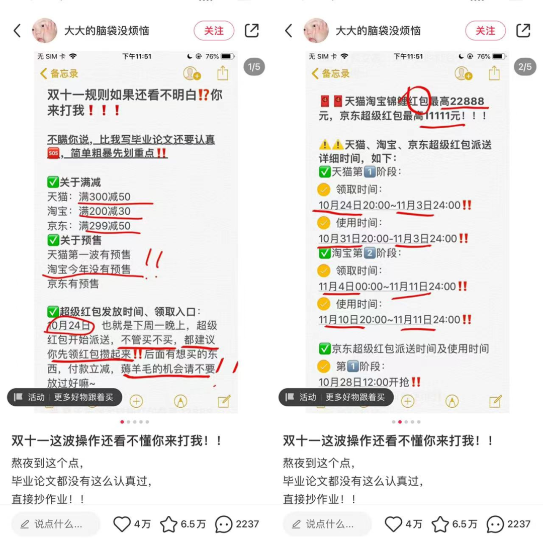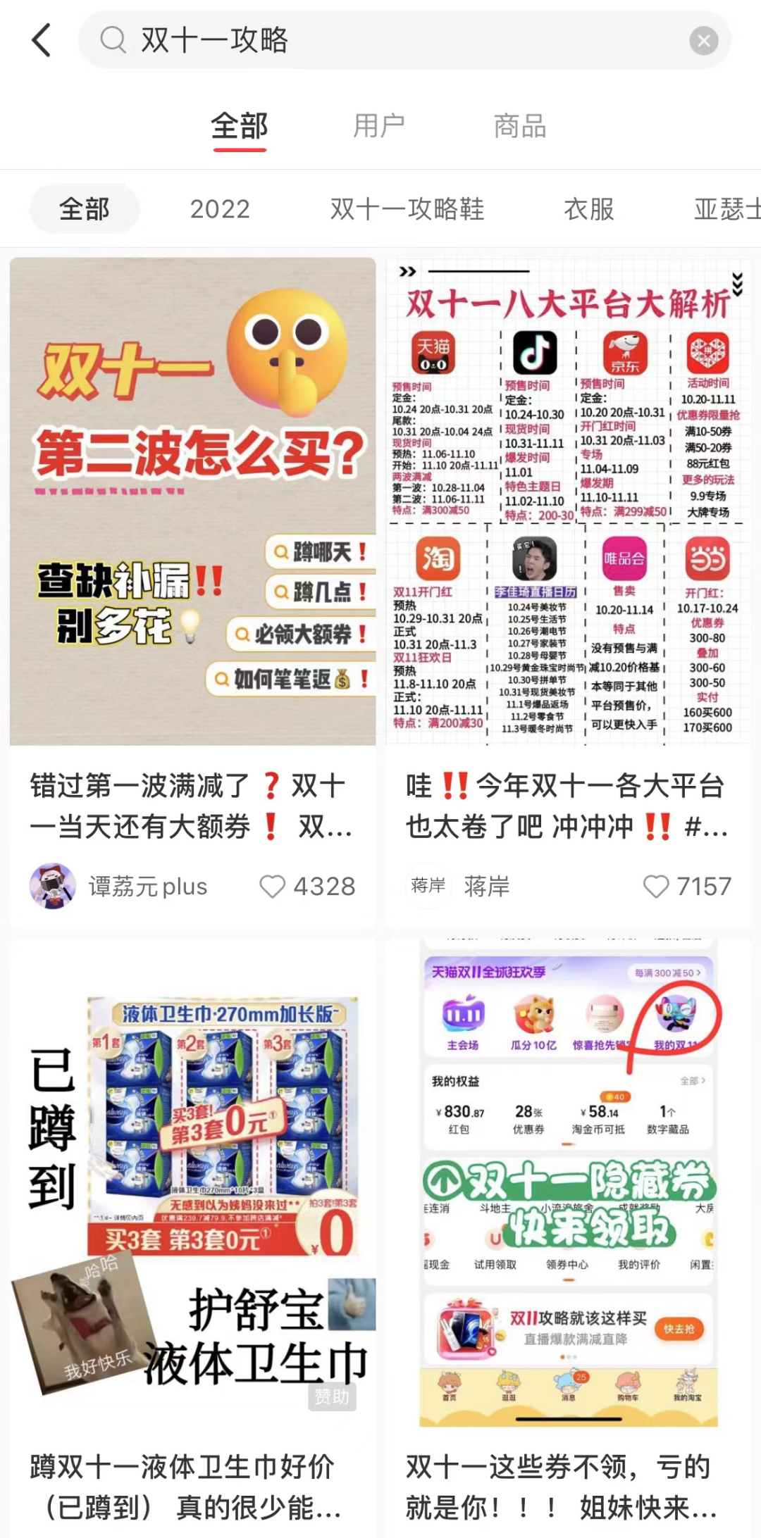 小红书上搜索“双十一攻略”一词,竟有上百万篇相关笔记的发布,随便打开其中一篇,都能发现各种薅羊毛的小技巧,包括但不限于如何领取红包和优惠券,如何找到直播间的特价商品,如何叠加多重优惠等教程。10000元的总金额通过各种极限凑单满减,最终只需付款五千,更有甚者,20000的总金额用完各种券后只需支付七千,谁看了能不为消费者的省钱智慧竖个大拇指呢?