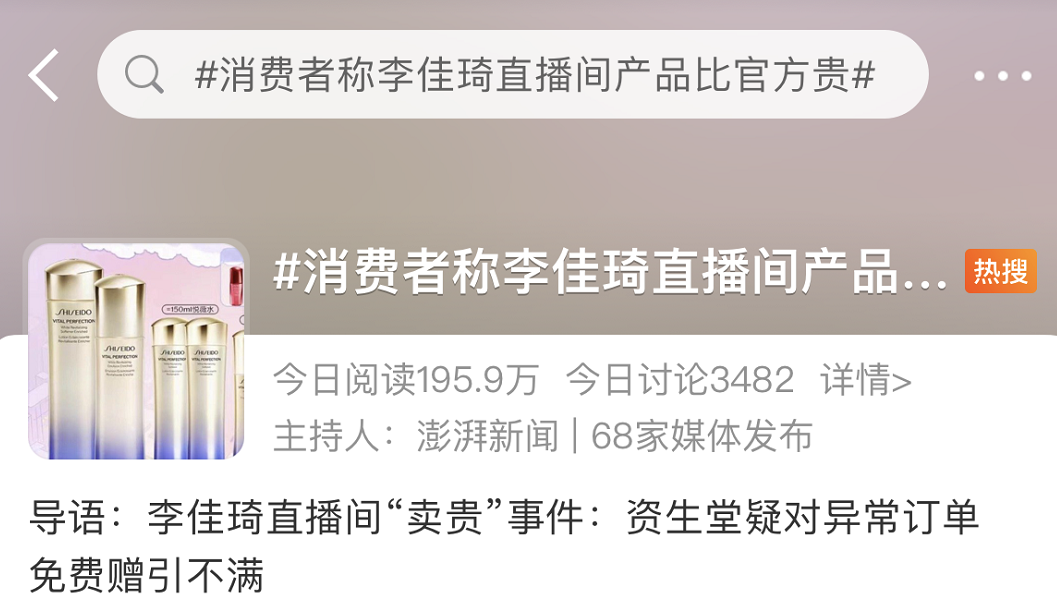 虽然没过几分钟资生堂就下架了该链接,但风暴还是由此诞生,李佳琦与资生堂双双成为争议主角。