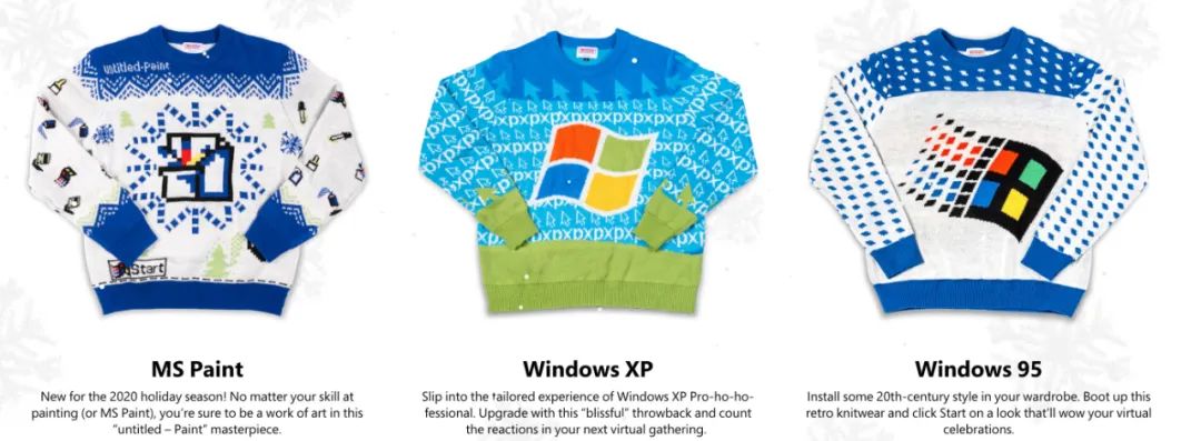 之后在2020年微软再次将之前的经典款 Windows 95拿出来,又新添了Windows XP 版以及经典“画图”软件为主题的版本丑毛衣开始售卖。并且3款毛衣在上架不到24小时就被抢购一空,可见受欢迎程度之高。