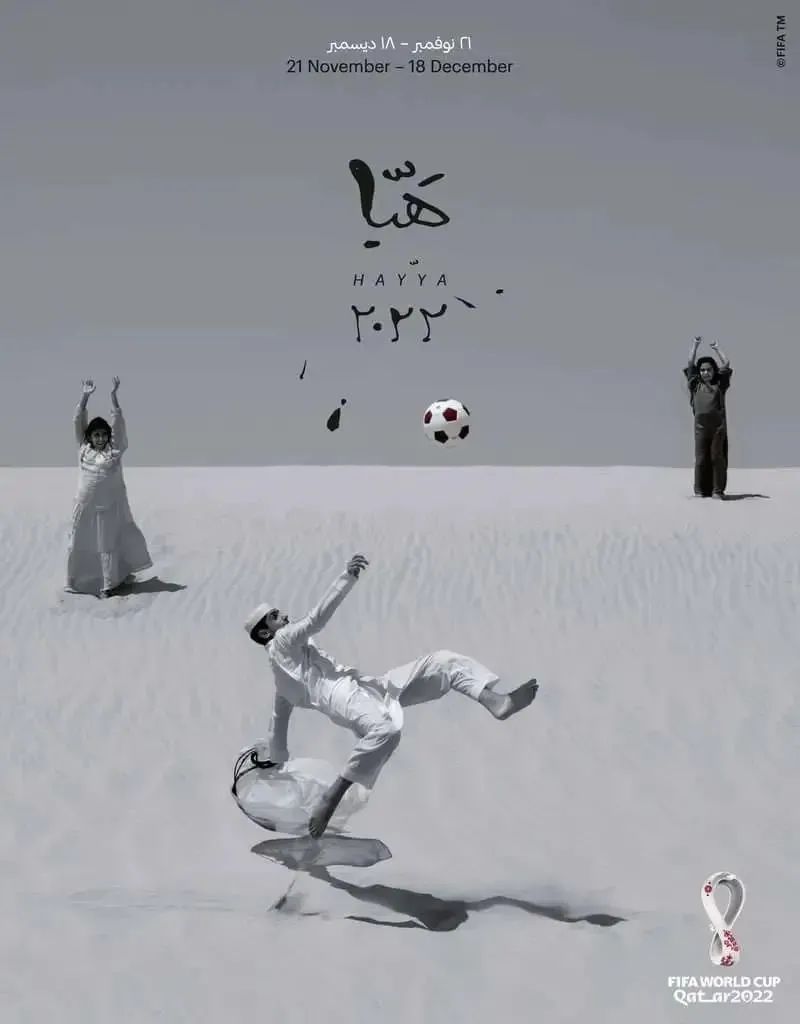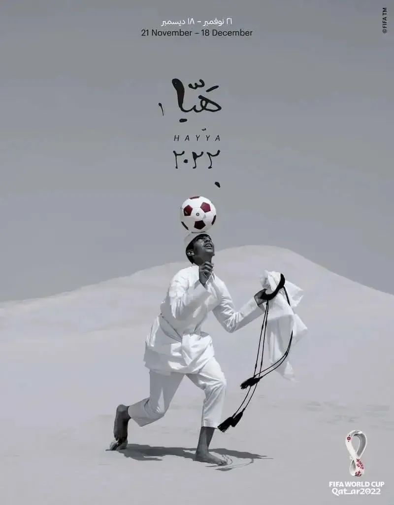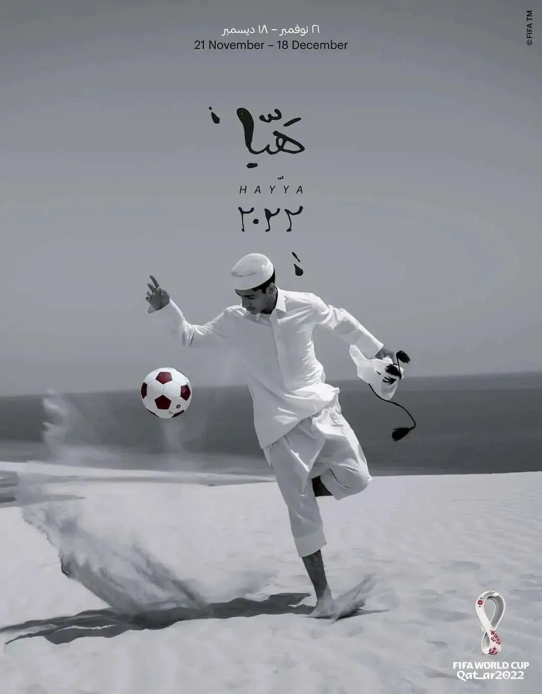 海报以本届卡塔尔世界杯的枣红和米白为主色调作为背景,主体是中东地区传统的白色头巾和飞扬的足球,并在海报正中写上了本届世界杯主题曲的名字Hayya Hayya (Better Together) 。