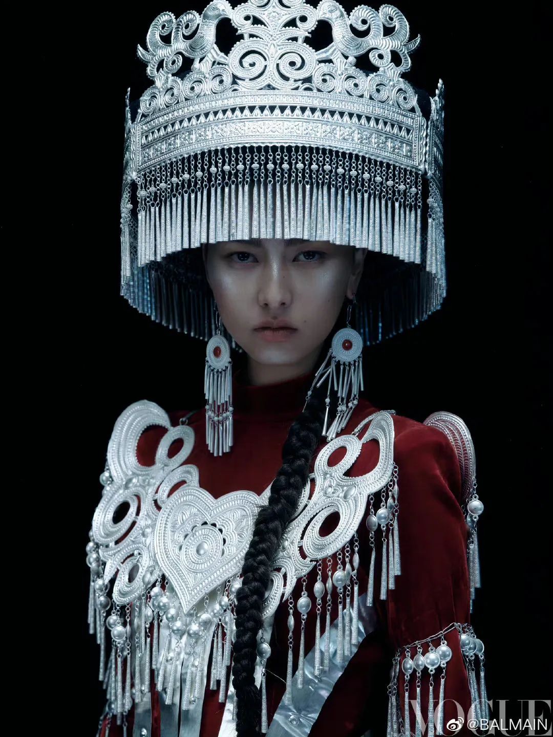 还有此前BALMAIN为VOGUE创刊 130 周年特别打造的彝族银饰红色丝绒连身裙作品,将彝族传统制银手工技艺与法式摩登先锋理念相融合,一方面借非遗文化展现出了 BALMAIN 女性摩登、性感、独立、优雅的人设形象,另一方面,品牌先锋独特的设计,也为少数民族传统工艺注入了更多时代气息,为其更好地诠释当代美学开辟了新的想象空间。