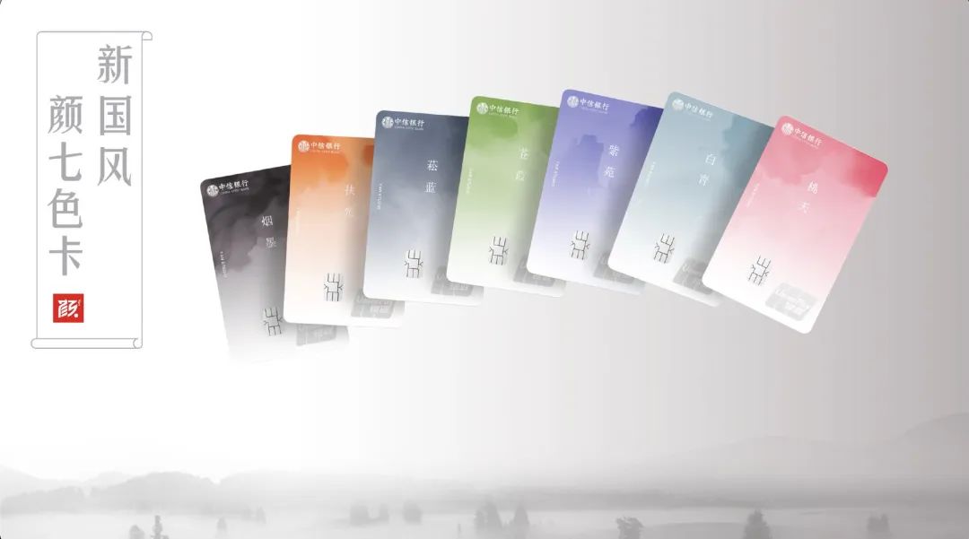 比如中信银行信用卡最新发布的「颜」系列新国风七色卡,分别命名为桃夭、白青、苍葭、菘蓝、扶光、紫苑、烟墨。