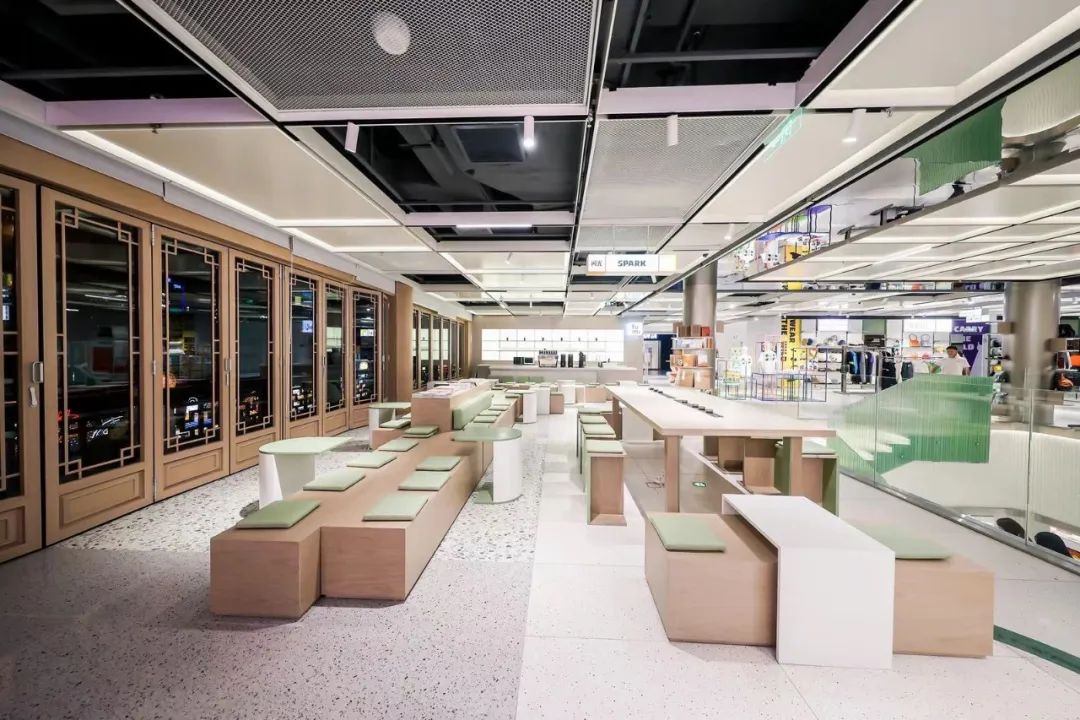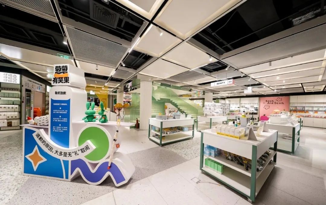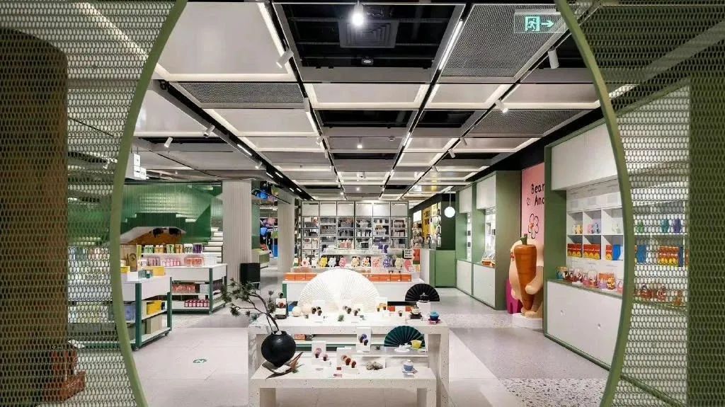 在空间场景的设计上,葱葱商店将 “逛园” 理念暗藏其中。具体来看,门店的空间布局打破了传统百货单一店铺的分割方式,将不同品类的产品分布式呈现在一个整体中。