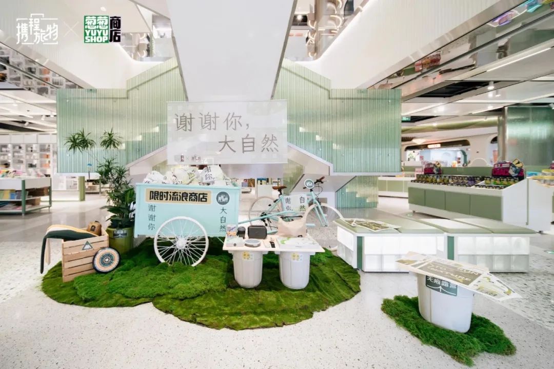 比如,葱葱商店与携程旅物一起联合九大旅行目的地,针对时下的户外热发起无痕露营倡议,在门店中推出「限时流浪商店」,并策划「谢谢你,大自然」环保主题展、举行「自然之礼」分享会,就自然、旅行、环保等话题与用户形成积极互动。
