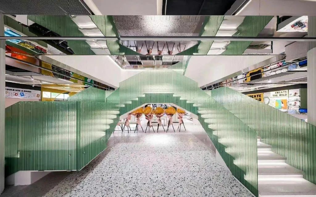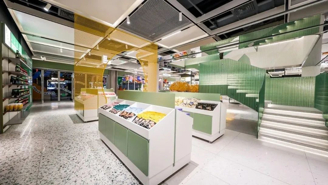同时,葱葱商店也将豫园的美学引入门店之中。比如,通往2楼的楼梯是以豫园的标志性建筑 「九曲桥」 为灵感,进行的立体演绎。而整体空间里,则融入了 框景、障景、藏亭等设计手法 ,形成具有东方生活美学的零售集合场所。