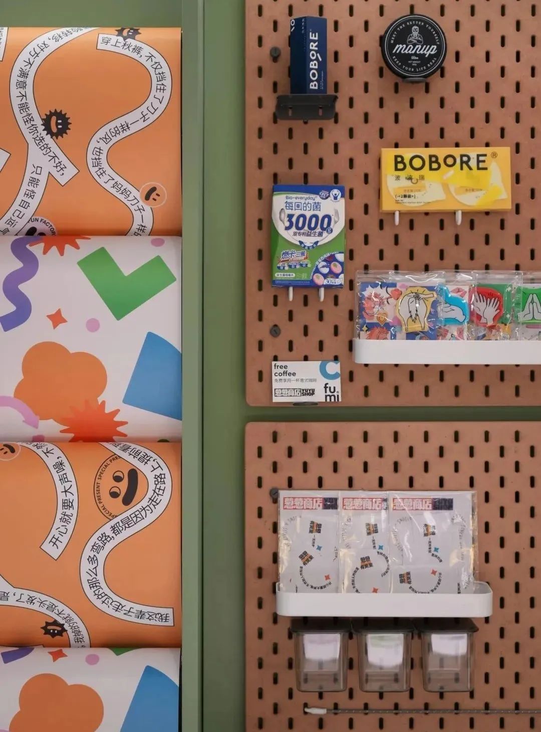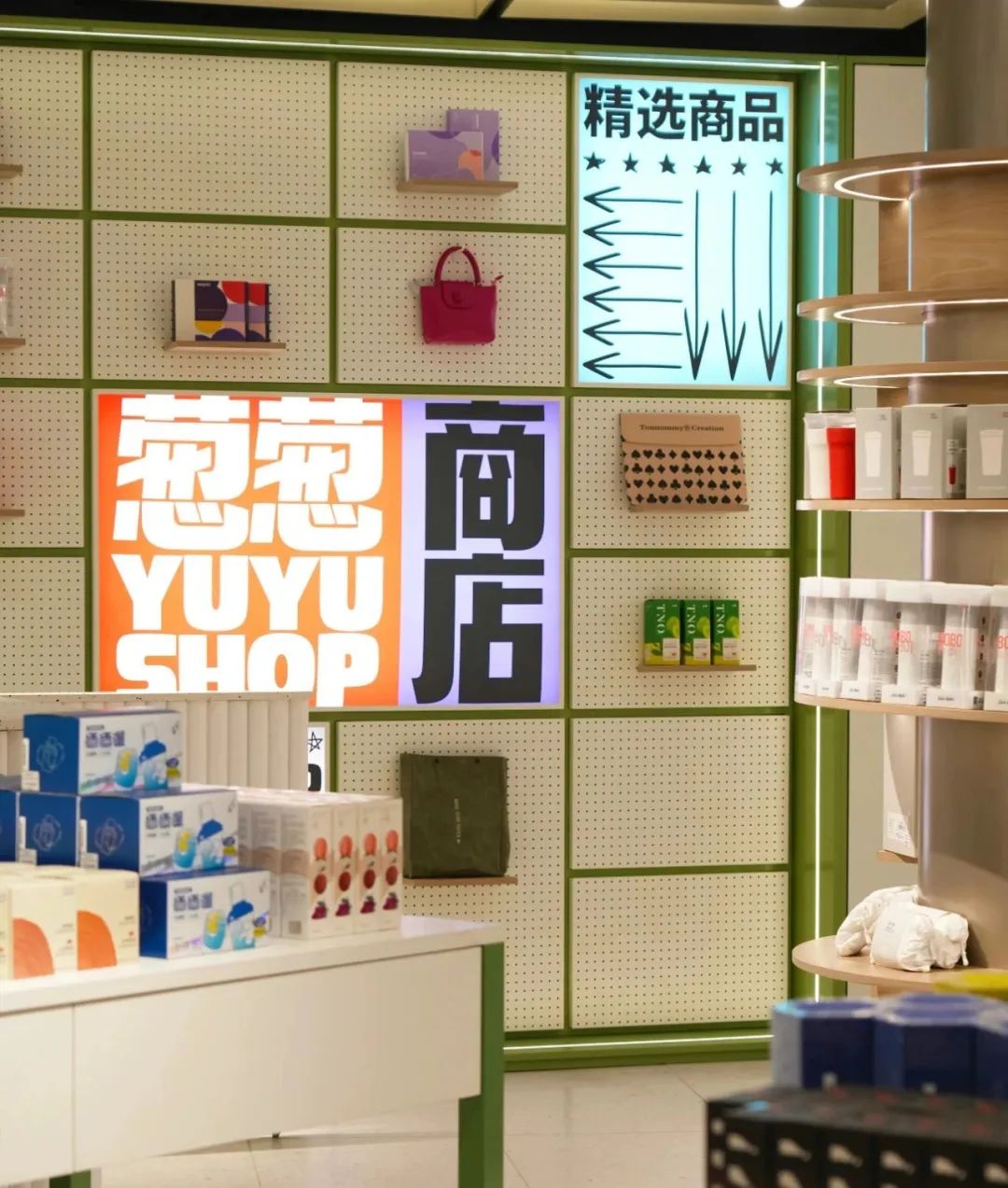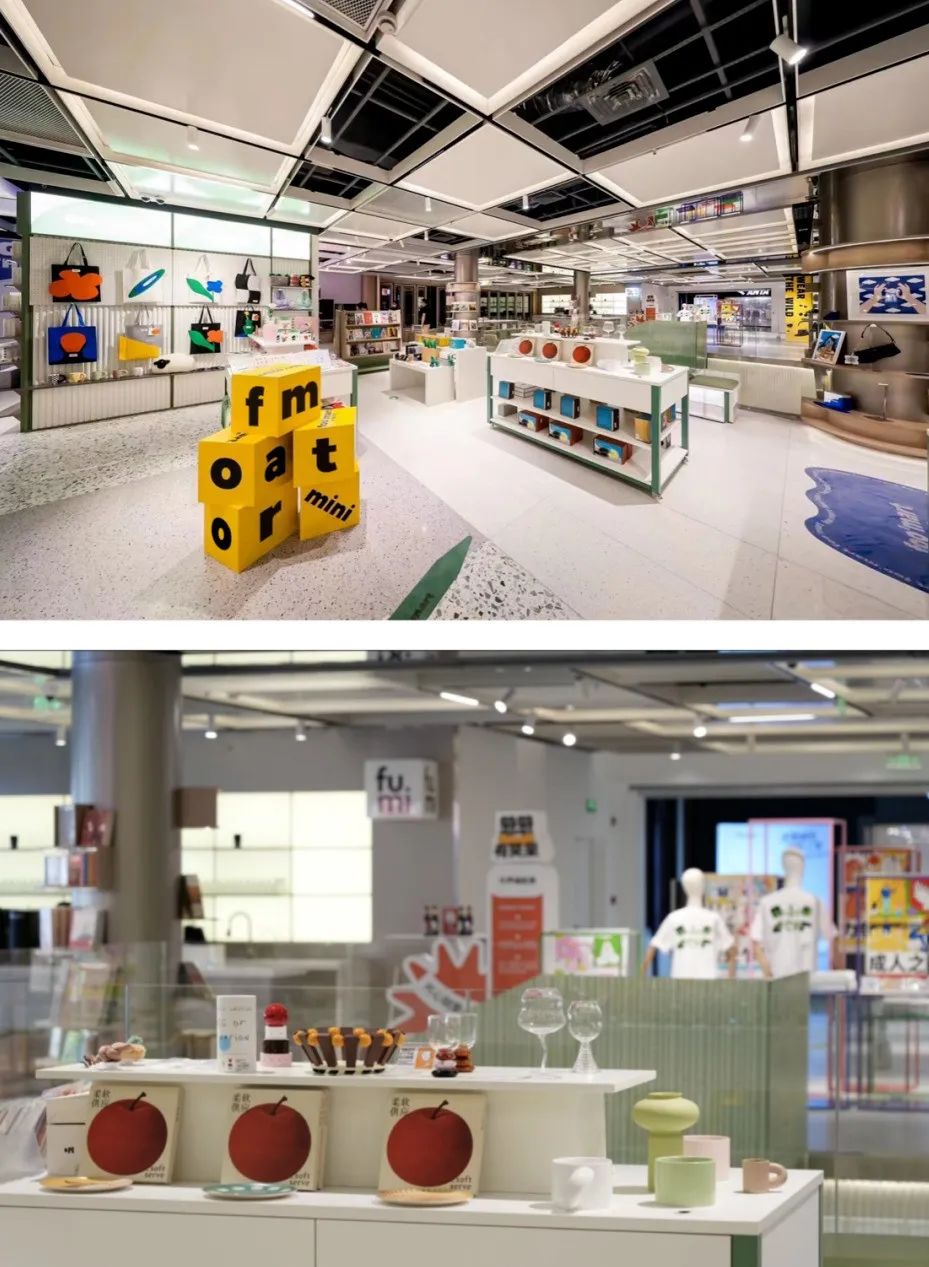 当中也会有一些专区,比如foo’mart幸福集荟携Tagi、Softseve、candle等品牌,在葱葱商店2楼的闪光SPARK区域打造了一个young art概念店,以缤纷的图案、配色为空间增添新活力;还有与BFC自营书店阅外滩构建的图书专区,与上海咖啡品牌fumi cafe合作的咖啡专区等。