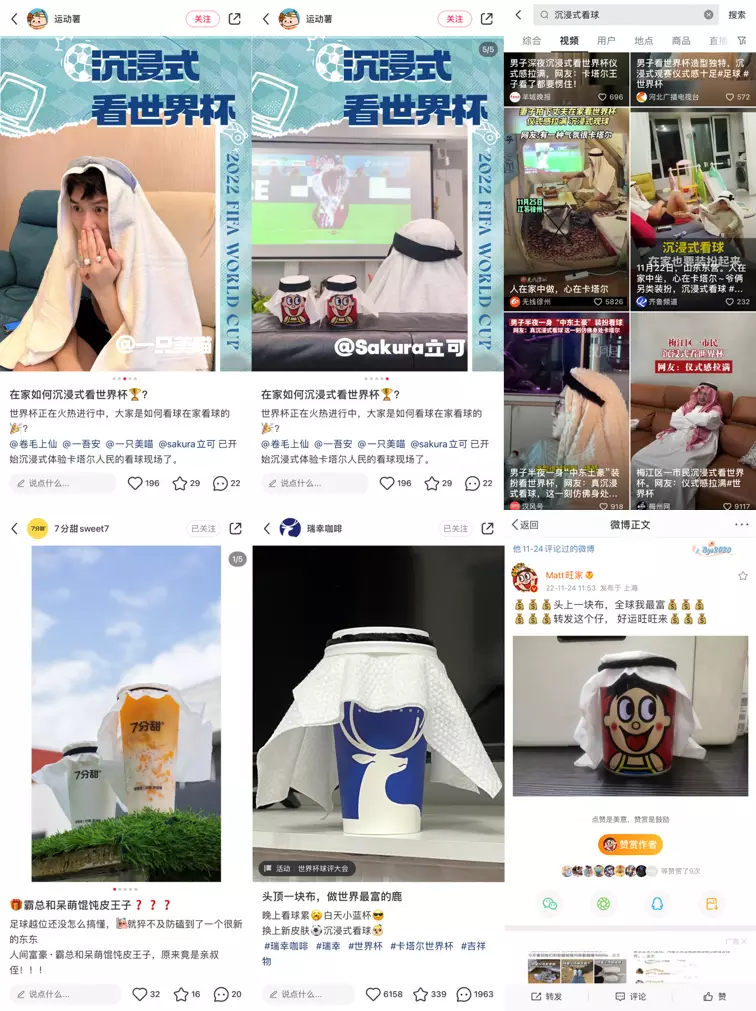 这样多元化的流量入口和互动方式,也给了品牌更多的营销灵感。比如不少品牌选择模仿网友“沉浸式看球”,给产品戴上“头巾”打卡一张“世界杯观球氛围照”。