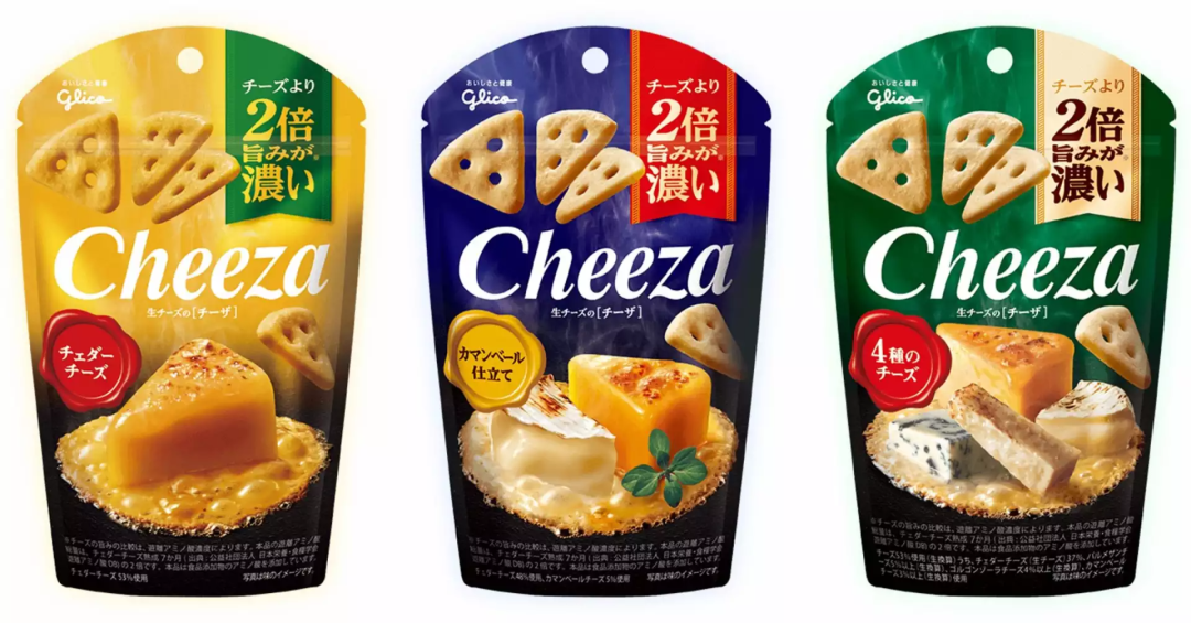2008年推出的Cheeza芝士脆片灵感则来源于在酒吧或者餐厅常用于搭配酒饮食用的芝士。产品定位于日本市场首创的天然芝士零食,以天然芝士为主要原料,通过调整芝士种类与配比和加工工艺,将天然芝士的美味浓缩在脆片之中,还原烤芝士的美味。