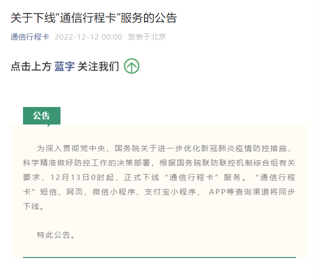 12月13日0时起,“通信行程卡”正式下线,“通信行程卡”短信、网页、微信小程序、支付宝小程序、App等查询渠道也同步下线。这是“新十条”优化政策以来,国家再次放宽出行层面的管控要求。