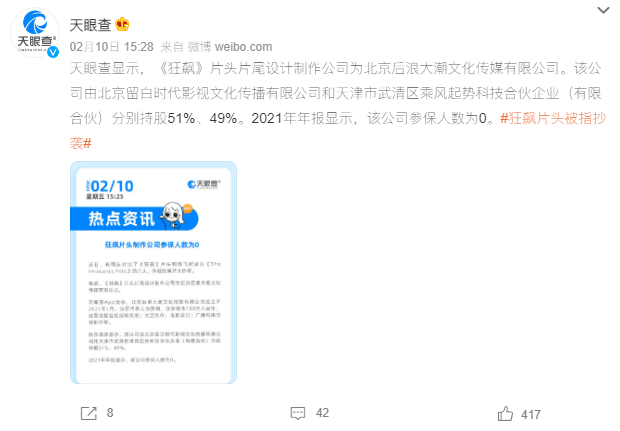 随后,更有更多细节爆出,天眼查官博表示,《狂飙》片头片尾的制作公司于2021年成立,参保人数为0,似乎为一个空壳公司转包。