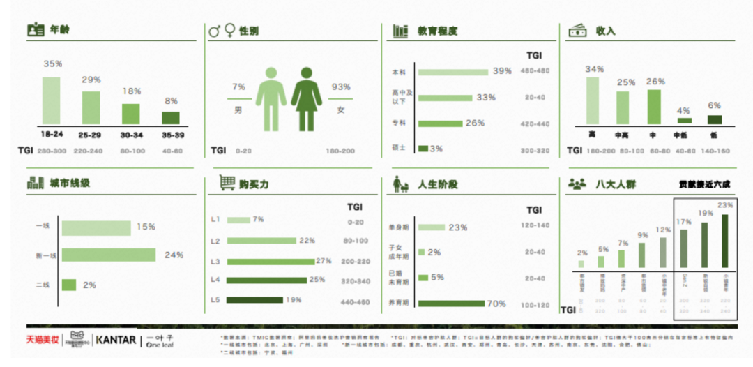 能够自觉做到更进阶地了解产品特点,因此,上述消费者能带来的消费频次是一般美妆护肤消费者的3.8倍,他们更多是18-29岁(64%)、居于一线及新一线城市(39%)拥有较高收入较高教育背景(本科达39%&硕士达3%)的女性(93%)。