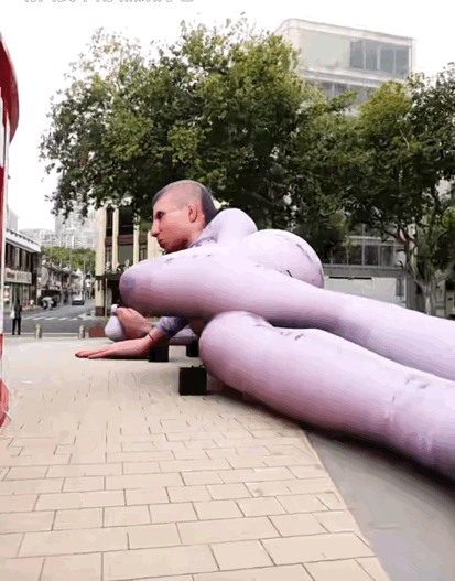 当这个身穿牛仔衣有7米高的人偶缓慢充气支棱起来,带来震撼的视觉冲击之余,还多了几丝恐怖气息。