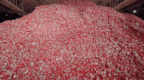 由20万盒杜蕾斯包装盒堆叠成为一座巨型山丘,场面可以说要多壮观有多壮观。