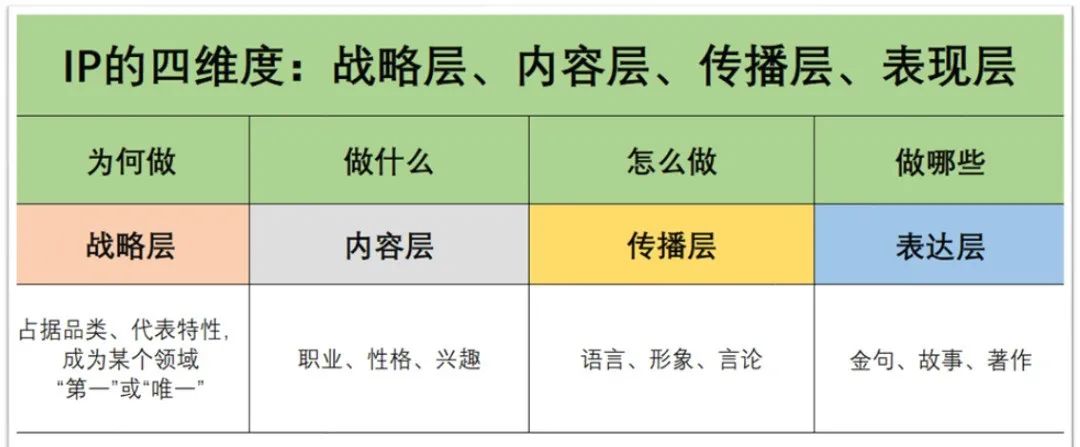 一个IP的语言、形象、言论是围绕其所要代表的品类、占据的特性而展开的。语言、形象、言论是形式,形式始终要服务与目的。所以,雷军在小米的前几年要坚定不移的传播专注、极致、口碑、快;罗振宇到死也要坚持60秒;吴晓波要搞新国货、新匠人、要开会、要颁奖。
