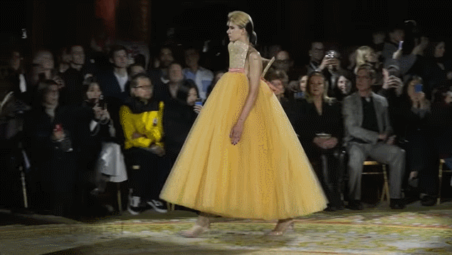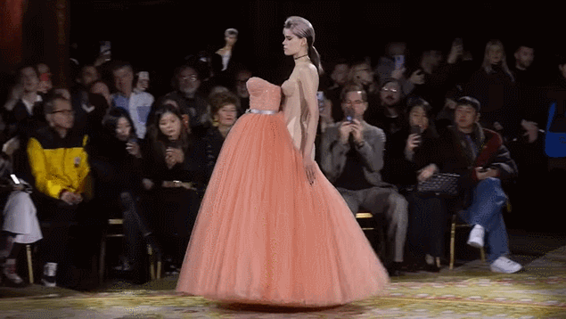只见模特们穿上了朝着不同方向的薄纱公主礼服走在秀场上,有的是横穿或者斜穿,有的垂直于身体。
