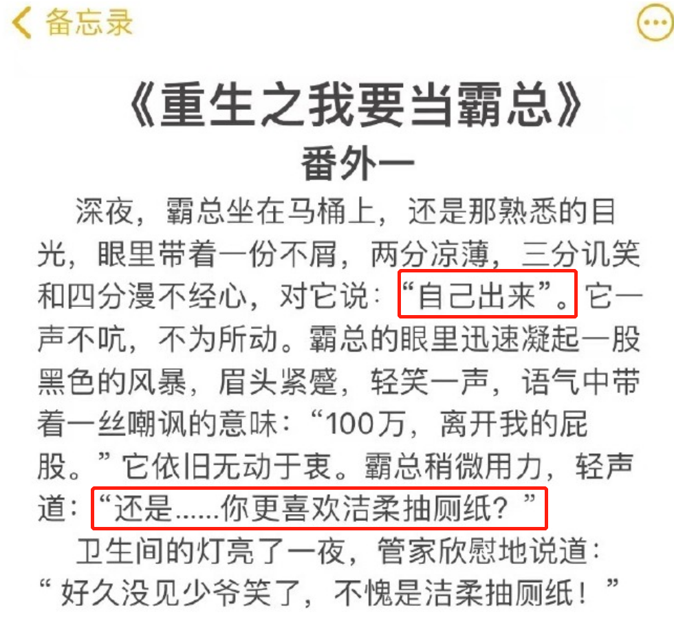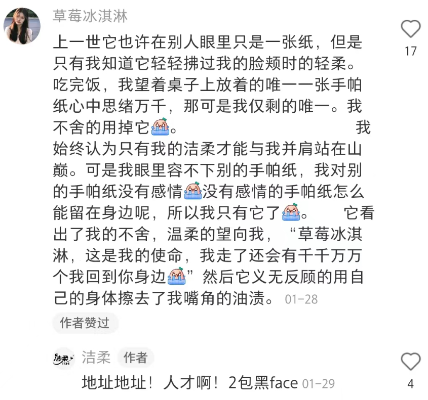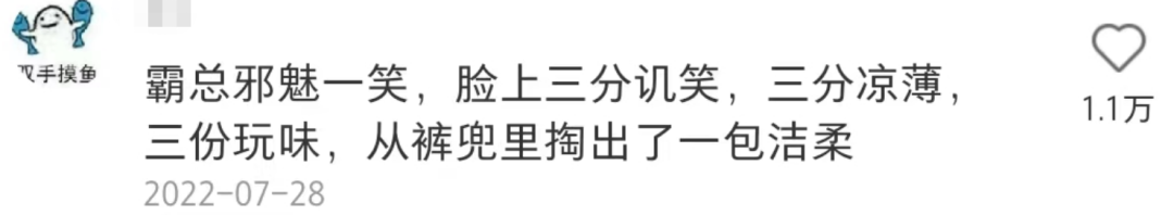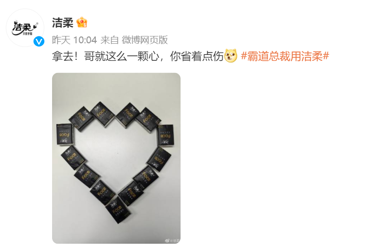 甚至第二天官微还晒出了在霸道总裁的小说里发现的洁柔: