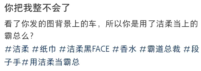 洁柔的古龙香水面纸被粉丝激情告白,说是霸道总裁的味道。(配图背景还是个大奔)