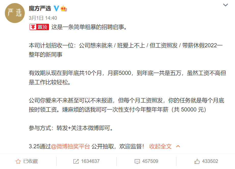 像魔方严选以一种打工人的故事来做抽奖引流一样。