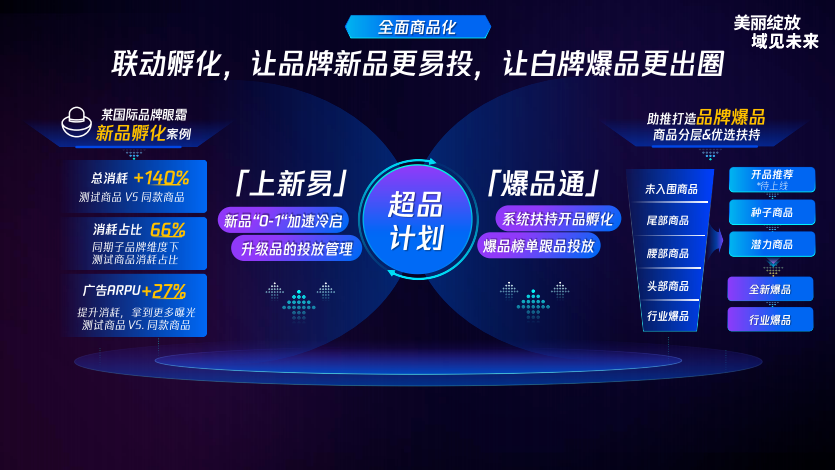一是在政策上扶持。 腾讯广告超品计划针对品牌新品和潜力爆品推出了“上新易”和“爆品通”产品,通过让品牌新品更易投,让白牌爆品更出圈的 “超品计划联动孵化” ,去加速新品从“0-1”的冷启动、用爆品榜单跟品投放去全面种草,让新品和爆品“有迹可循”。