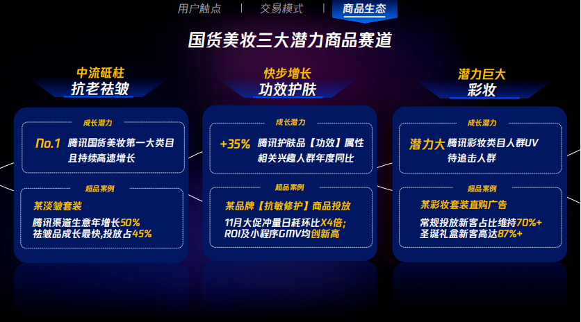 二是在系统上革新。 面对新品起量难、老品扩量难、成本波动大等广告投放问题,腾讯广告以商品信息作为串联的“人货匹配”模式,基于“系统懂货”和“系统懂人”能够使商品广告更科学、准确地匹配到更适合地消费群体,实现真正意义上的品效合一。