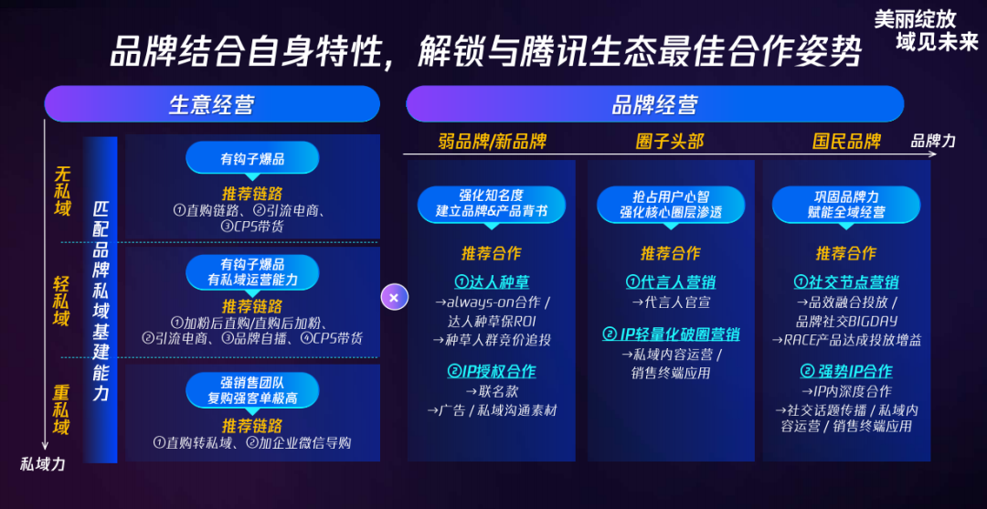 有着强大社交属性和完整全域生态的腾讯生态, 为合作品牌提供的不只是销售渠道,而是能助力其建立可持续经营的品牌阵地。 平台能为品牌提供加粉链路、直购链路、视频号直播、引流电商、云选量效通等生意经营模式,更科学、准确地帮助品牌强化价值输出和心智影响。也让品牌能在这种开放、多元的方式和触点中,结合自身特性,摸索出一套适用于自己的经营方法,从而实现更加稳健的增长。