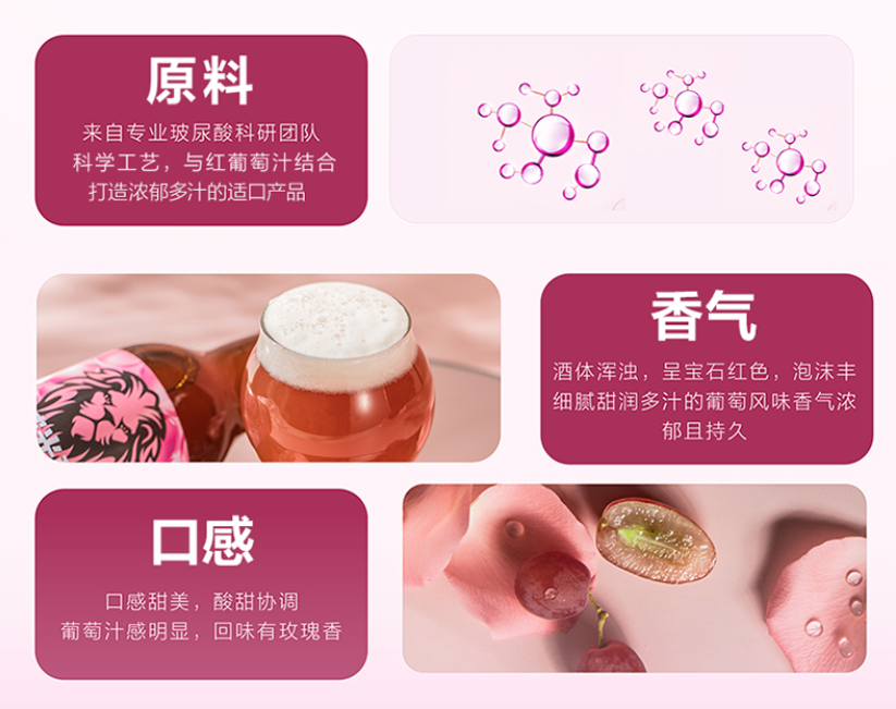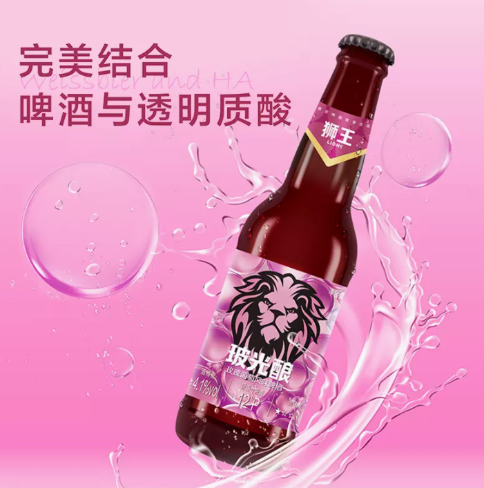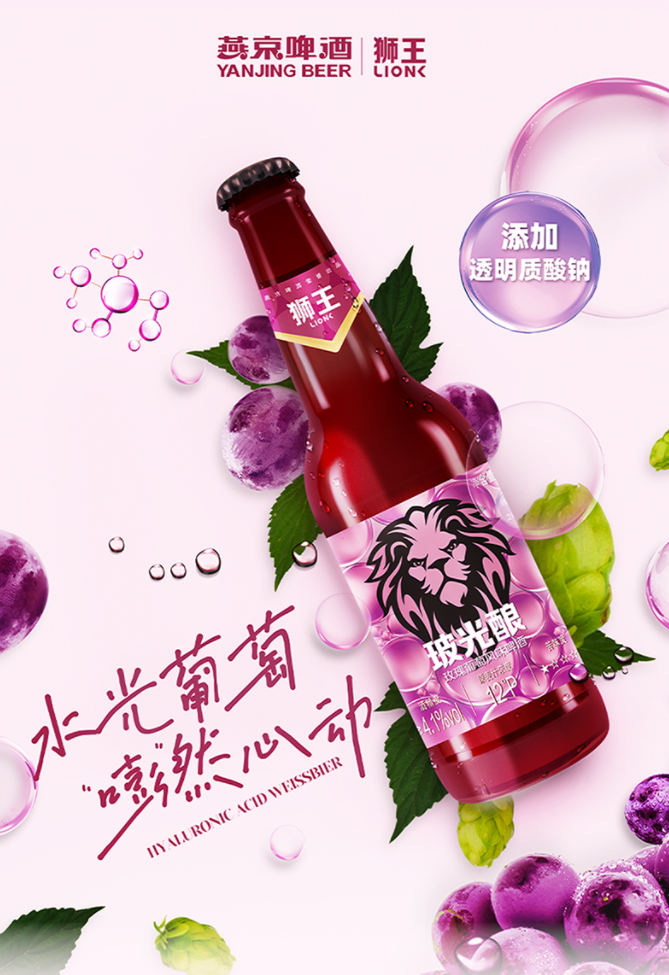 如最近,燕京啤酒就另辟蹊径推出了首款玻尿酸啤酒,这款被品牌命名为狮王玻光酿玫瑰葡萄精酿啤酒的新品,将可食用玻尿酸、红葡萄、玫瑰等多元素融合,采用独特的制作工艺,提出了“玻尿酸、女性啤酒”的新营销鲜概念,直指女性消费市场。