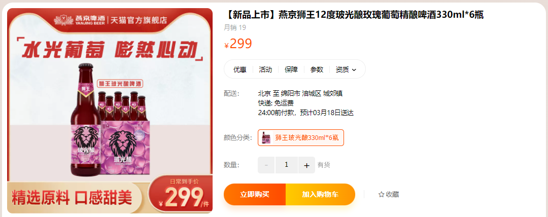 从品牌的官方淘宝店铺看,此款啤酒规格为330ml每瓶,售价是6瓶为299元,折算后50元/瓶,售价高于市场上啤酒定价。