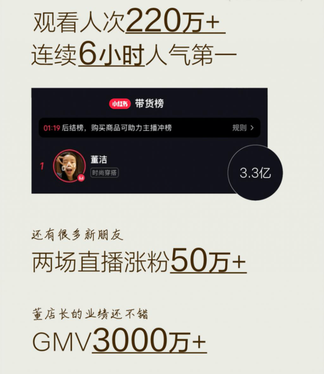 最近,董洁用一场GMV3000万、涨粉50万、观看人次220万、热度2亿的直播数据,成功登上小红书带货榜第一名,并被媒体冠上 “小红书一姐” 的名号。