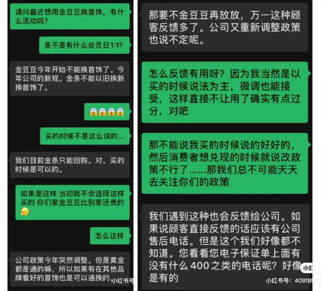 而这些好歹还能回收。有小红书网友在1月反馈,此前在周大福买金豆豆时承诺可以换金饰,但现在,这项服务突然就没有了。“亲亲可以投诉哦,说不定投诉多了我们就恢复了”,这是柜姐给她的回应。