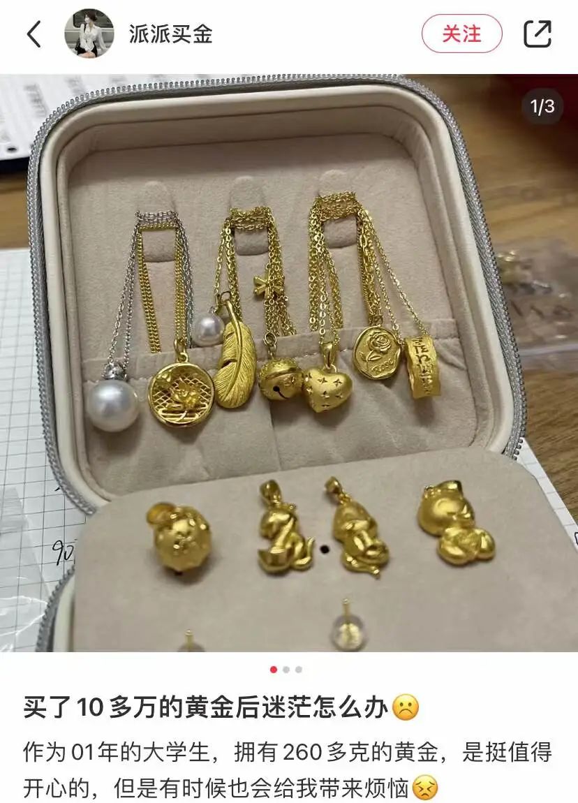 在小红书上,“黄金种草”盛行,但“拔草”笔记更是随处可见。年轻人发现,因为金饰在佩戴过程中很容易出现磨损变形,“每一次戴出去都要小心翼翼,毕竟一磨可能几十就没有了”,小红书用户@派派买金 分享了自己购买了10万元黄金后的迷茫,“一开始买黄金是为了戴,现在买得多反而不戴了,每天放着,还担心被偷”。