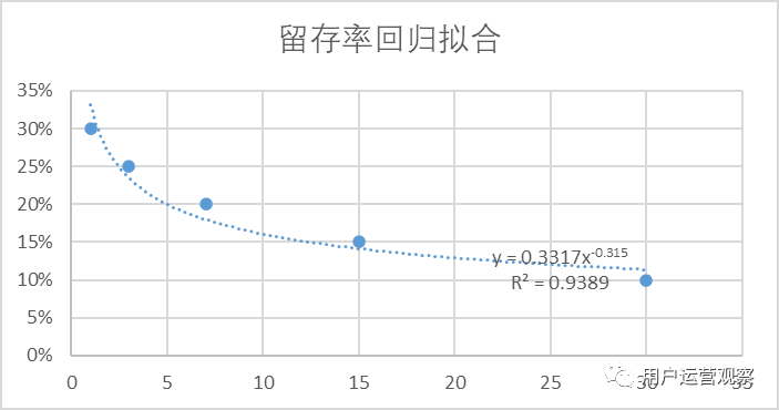 使用以上的30天留存数据先生成一个散点图,然后插入趋势线,选择幂函数,下方的显示公式和显示R方都选中,这样就得到留存率的拟合图和公式。