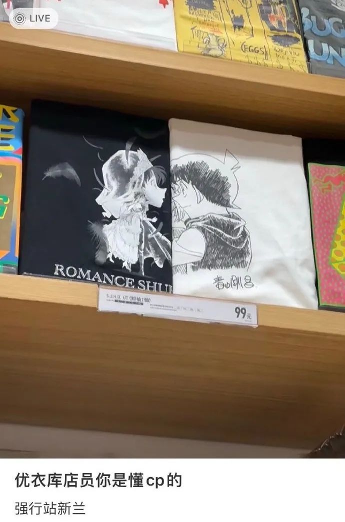 在优衣库的官方宣传图上,柯南身穿“柯哀”T恤;在线下门店,“柯哀”T恤也是摆在显眼的位置。